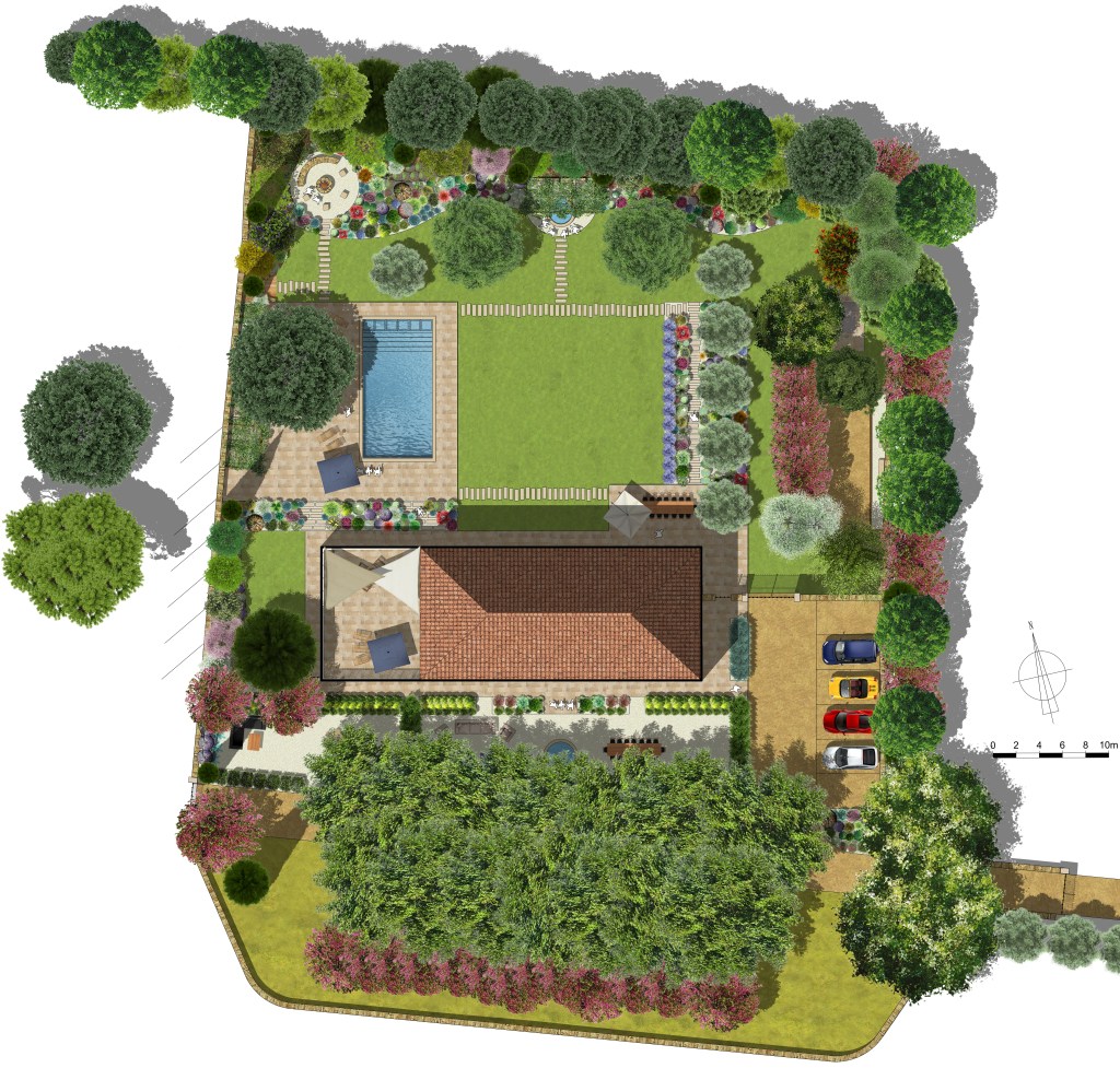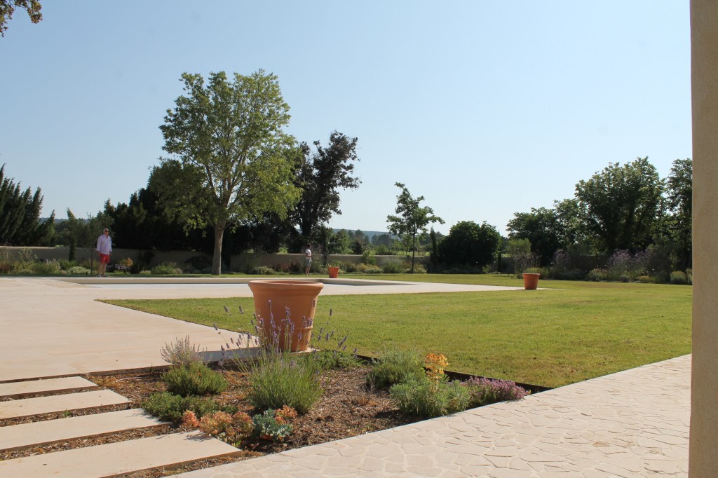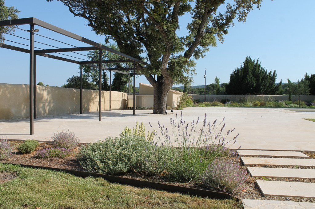 Allée champêtre soulignée par un double alignement de cyprès existants, parvis d’entrée sous le vieux mail de platanes, stationnements, accès piétons, terrasses, jardin clos et espaces de détentes ont été conçus dans un esprit résolument Provençal. Pergola végétalisée, boulodrome, coin café, terrasse attenante à la piscine et espace de jeux pour enfants s’intègrent harmonieusement dans les massifs, pelouses ou prairies rases et participent à dessiner les usages du jardin. Ces aménagements créent des lieux conviviaux où il fait bon vivre au fil des saisons, à l’image d’un brasero, d’une fontaine ou d’un banc à l’ombre d’une pergola.