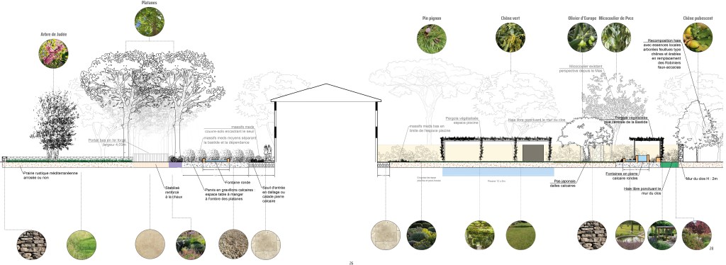 Le projet a consisté à concevoir l’ensemble des extérieurs du Mas récemment réhabilité et rénové, conserver la trame arborée existante qui participe à magnifier le lieu et proposer des aménagements au sein du jardin afin de profiter des lieux en toutes saisons.