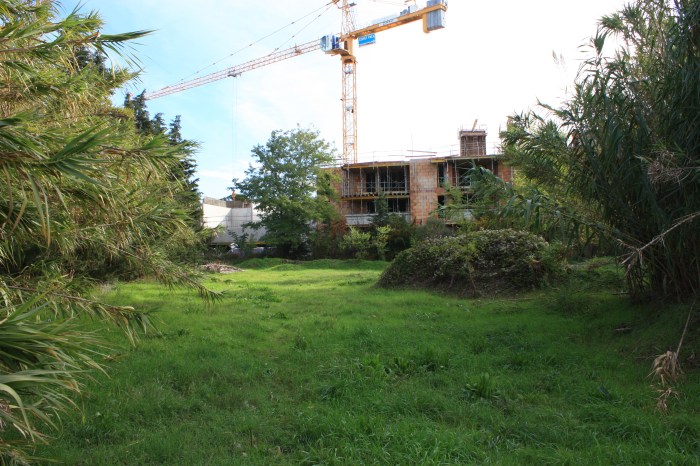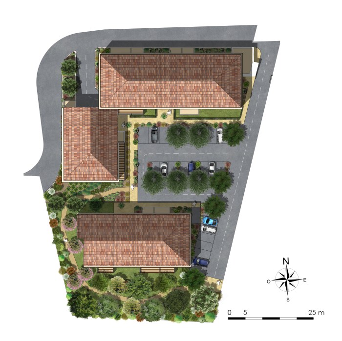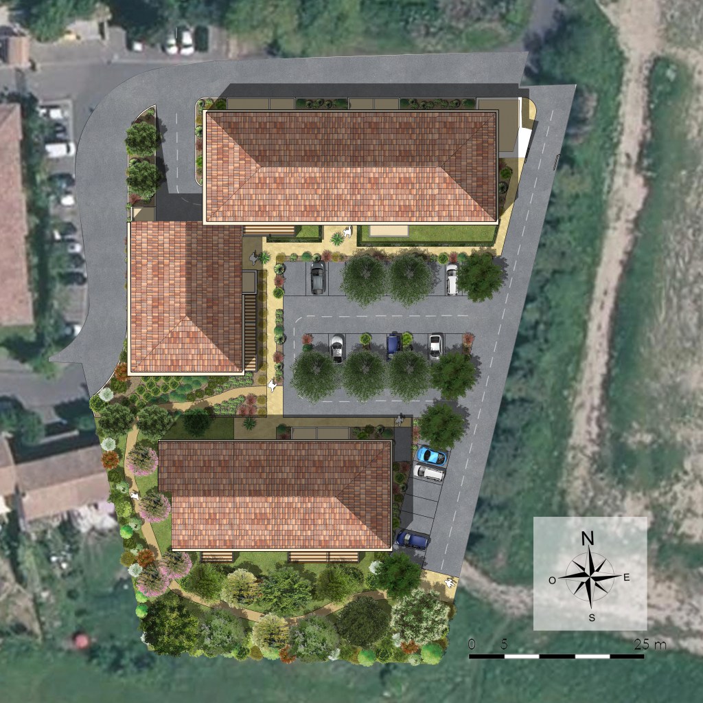 Kaufman & Broad nous a confié la réalisation du volet paysager pour la demande de permis de construire d’une copropriété de 67 logements dans le quartier de l’Auzon à Carpentras. L’assiette foncière correspond à 4 parcelles d’une superficie totale de 6795 m2, il s’agit d’un vaste terrain vague en bordure du cours d’eau de l’Auzon. Les parcelles concernées par le projet sont situées au nord du centre ancien de Carpentras, un espace attractif de la ville (commerces, espaces culturels, patrimoine architectural, loisirs…). Elles se trouvent à 700 m à pied du centre-ville et à 500 m de la D942, dite «Rocade nord». Il s’agit d’une position géographique stratégique pour un projet d’habitation collectif résidentiel.Comme évoqué précédemment, l’Auzon, cours d’eau traversant la ville de Carpentras d’Est en Ouest serpente à quelques dizaines de mètres au sud des terrains en projet et offre au site un cadre qualitatif et verdoyant. Un projet de coulée verte, récemment inauguré, a permis d’aménager ses berges et offre un espace public remarquable aux portes du centre-ville via un vaste parc adossé au cours d’eau. Un accès direct à cet équipement majeur est ainsi possible, traversant le vallon par une passerelle piétonne et un réseau de cheminements à travers l’Auzon. L’orientation des 3 bâtiments, des voiries et des parkings a ainsi permis de dégager un espace vert commun aux résidents, de type parc arboré. Il est agrémenté de fruitiers, de grands feuillus et de bancs, et propose un cheminement en stabilisé renforcé permettant l’accès (via un portillon fermé à clef) aux cheminements et à la passerelle piétonne de la coulée verte. Ainsi les résidents bénéficient d’un cadre de vie qualitatif, à la fois en terme paysager et écologique, mais également en terme de logistique et d’usage car jouissant d’un nouveau mode de transport doux dans le tissu urbain.