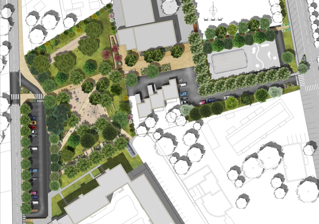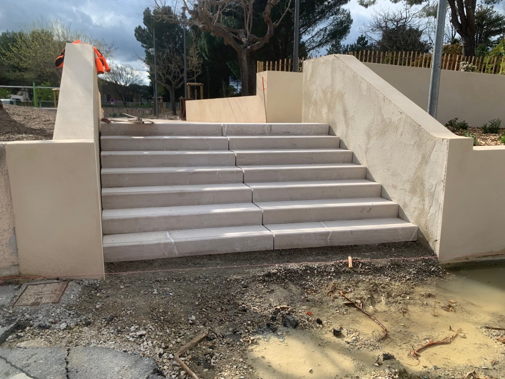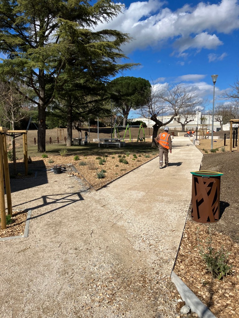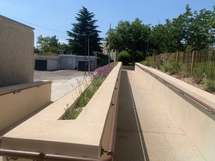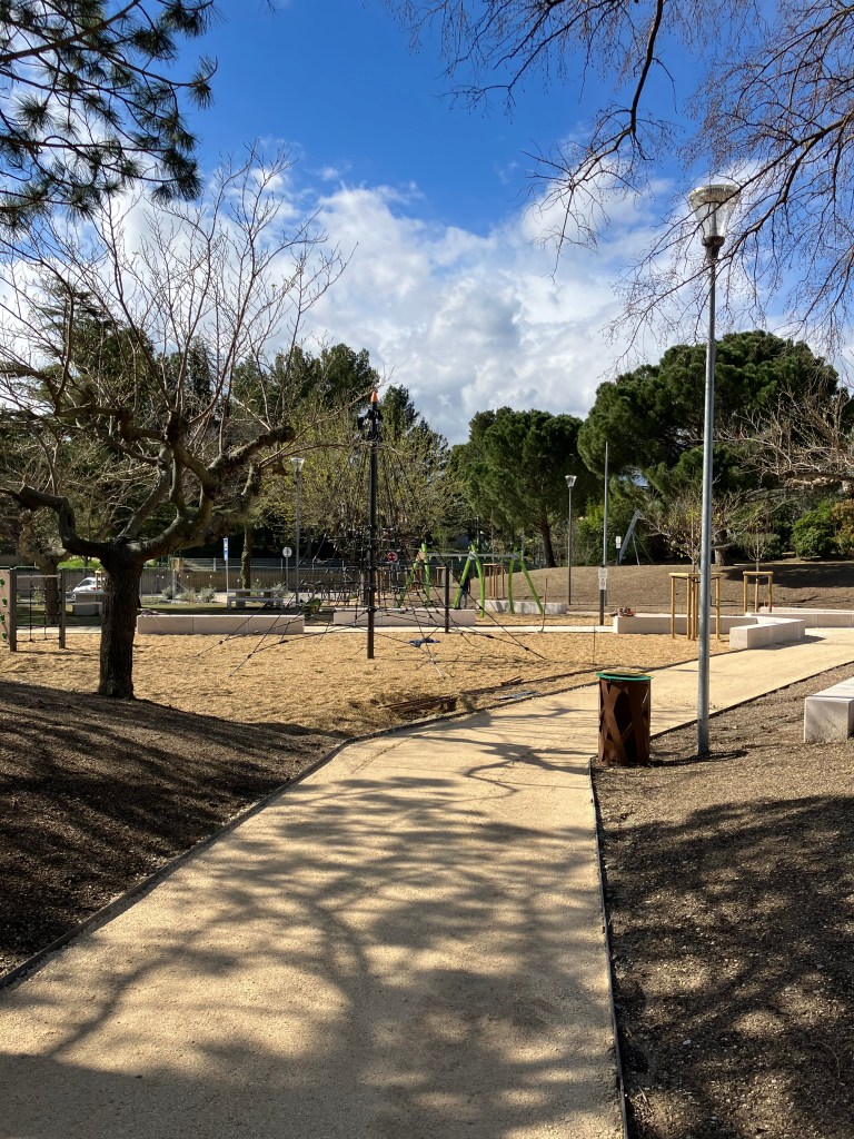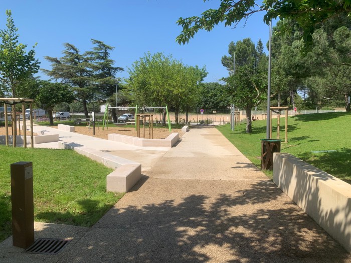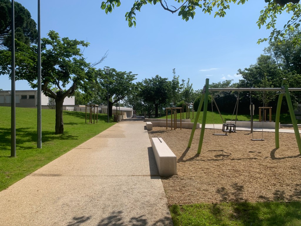 Le parvis de l’école sera dessiné dans le prolongement de l’allée principale du parc avec l’utilisation d’un même revêtement (béton désactivé) et se prolongera jusqu’à l’avenue Fossombrone en ligne droite. Cette nouvelle desserte permet de créer un espace totalement sécurisé pour les enfants, elle permet aussi d’ouvrir et d’intégrer l’aire pour adolescents à l’aménagement.