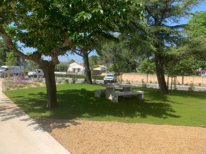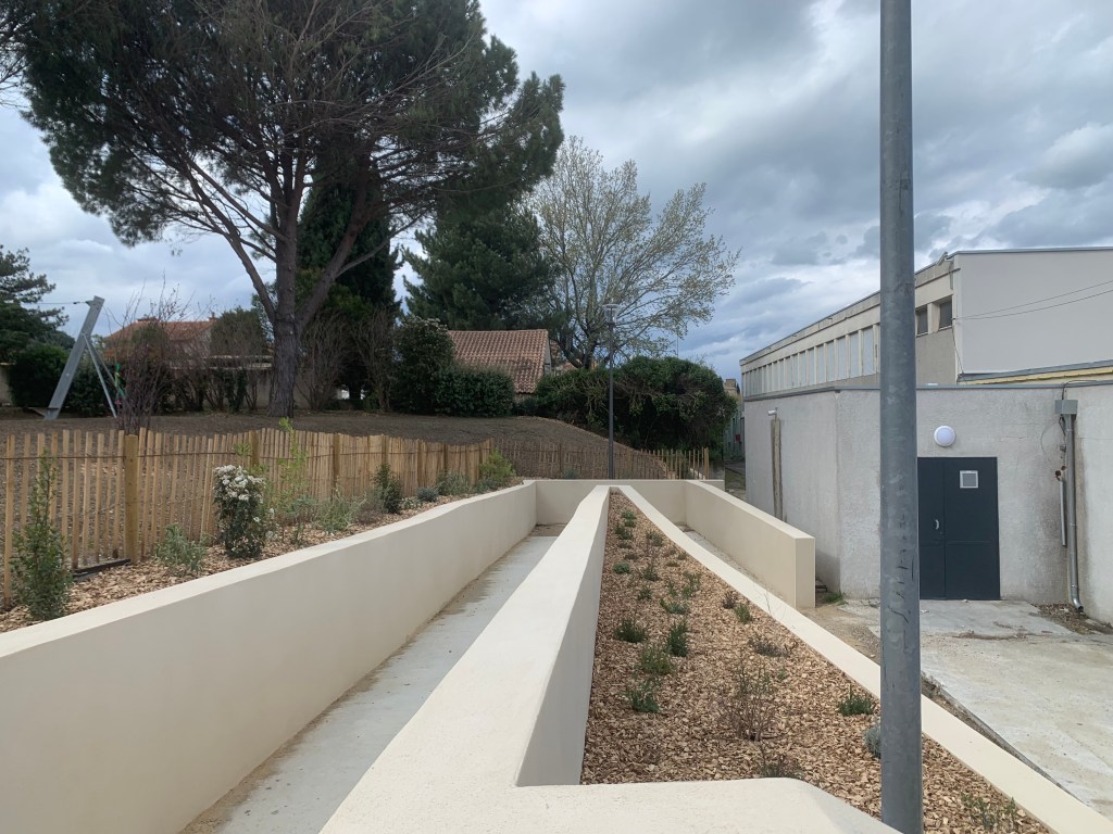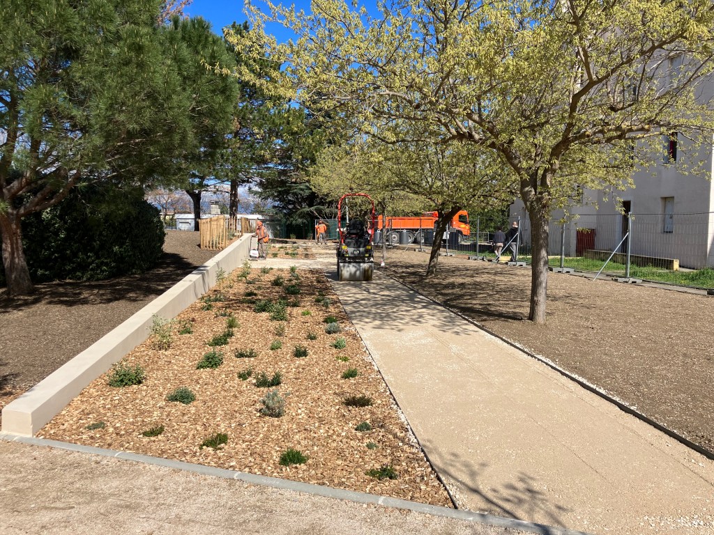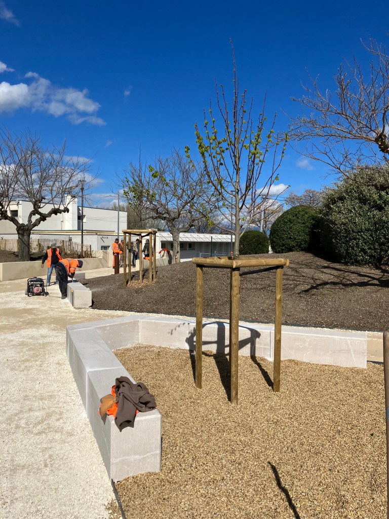 L’espace devant l’école est divisé en deux afin de créer un véritable parvis : jardinières, plantations, bancs, nouvel abri vélo viendront compléter l’ensemble. Des places de stationnement seront installées le long de l’allée des Jonquilles et devant le local de l’association (15 places), tandis qu’une requalification complète de l’enrobé est prévu.
