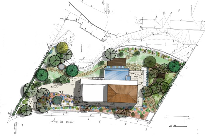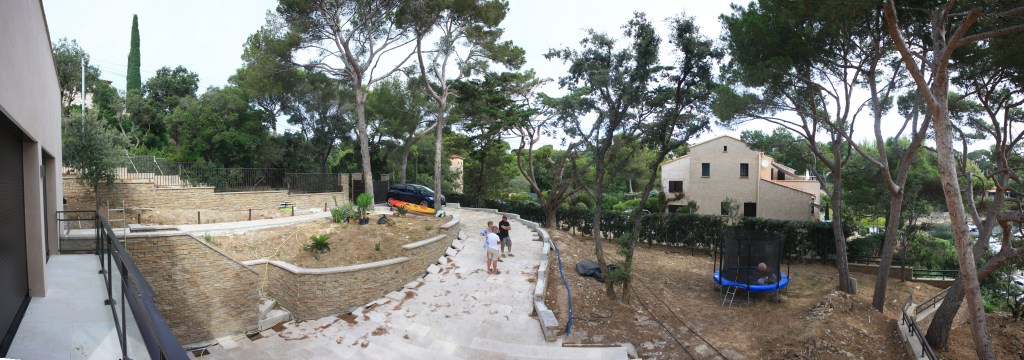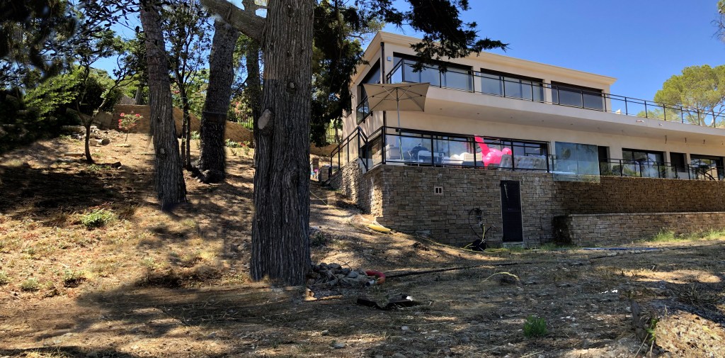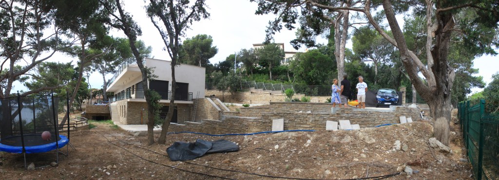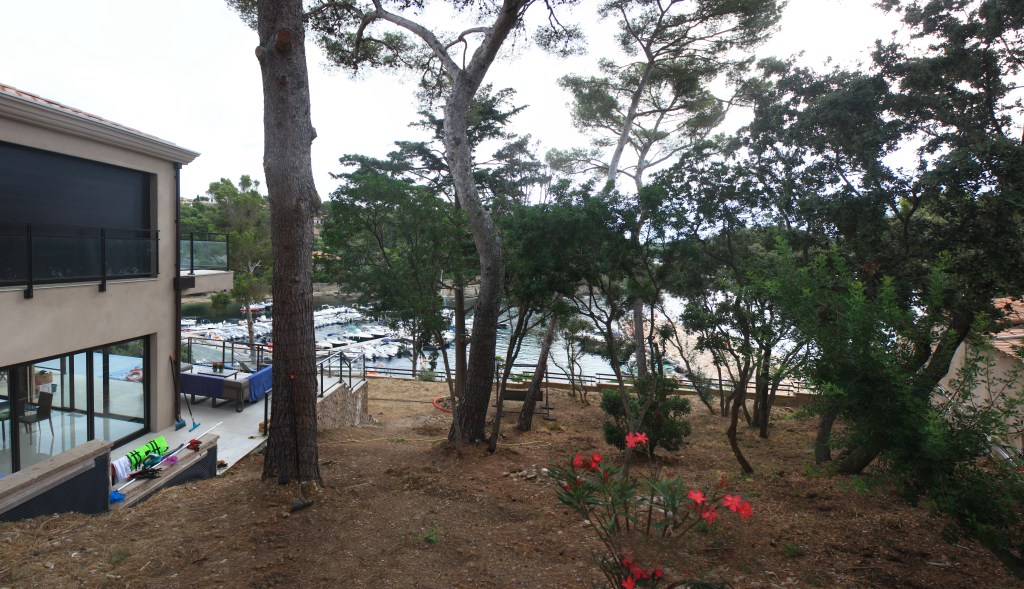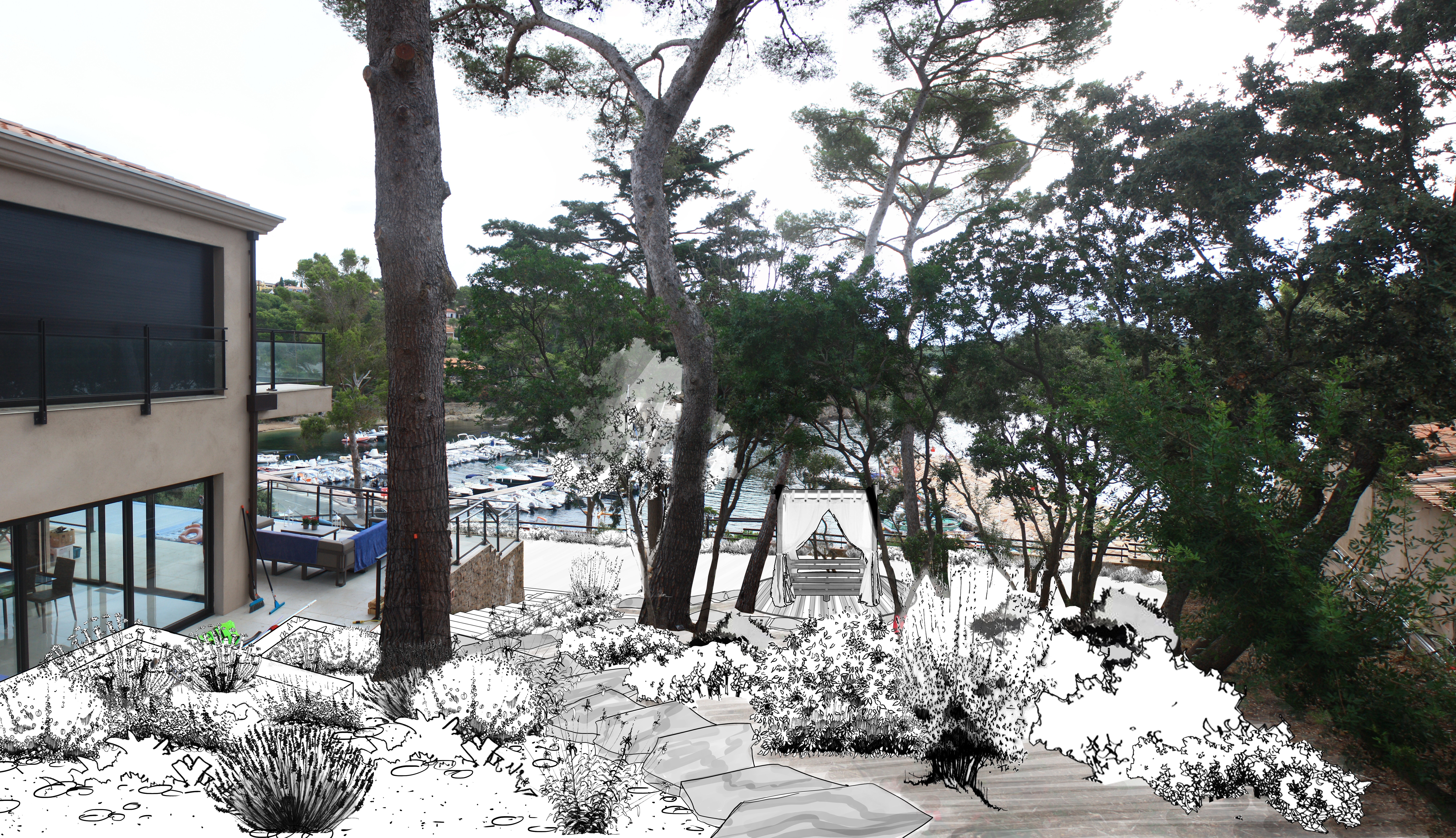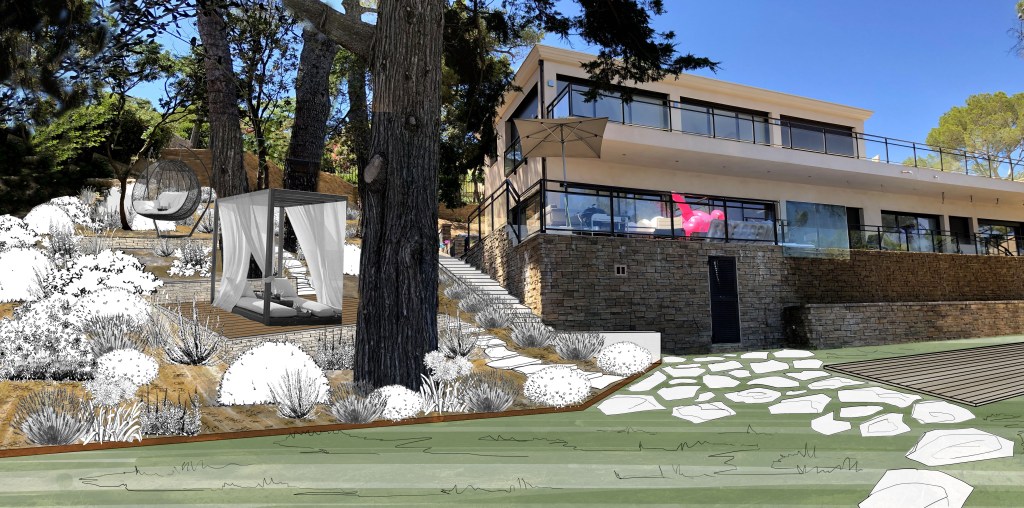 Le projet de jardin se devait de proposer un jardin méditerranéen contemporain, simple d’entretien, limitant un maximum les vastes étendues de pelouses en révélant les différents arbres encore présents sur la parcelle. Des alternatives au gazon ont ainsi permis de s’abstenir d’installer un gazon classique, très gourmand en eau et séchant souvent inexorablement au cœur de la période estivale. Ce choix a permis de limiter les besoins en eau du jardin et de proposer une végétation parfaitement adaptée au contexte, il en va de même pour les apports d’engrais ou de traitements phytosanitaires, généralement désuets de sens sur ce type de palette végétale. Terrasses attenantes à la villa et à la piscine, espaces de repos à l’ombre de la pinède, pergolas, chemins piétons à travers le jardin et espace de jeux pour les enfants, autant de lieux de vies à créer et à intégrer dans ce coin de colline en belvédère sur la mer.