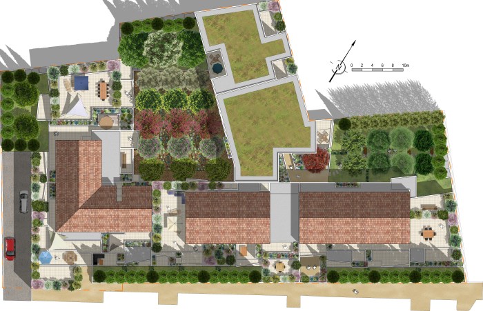 Les espaces verts de pleine terre, permettant un développement optimum de la strate arborée, offriront des pelouses ombragées agrémentées d’arbres de moyens développements, d’arbres fastigiés et d’arbres fruitiers, ces derniers seront principalement situés dans l’espace vert commun accessible aux habitants de la résidence afin de constituer un petit verger. La profondeur de sol assurera une reprise et un environnement idéal pour ces sujets en tiges, à port colonnaire ou ayant comme finalité la production fruitière.