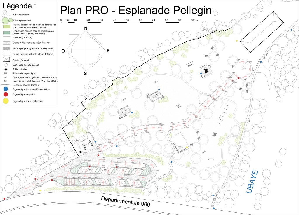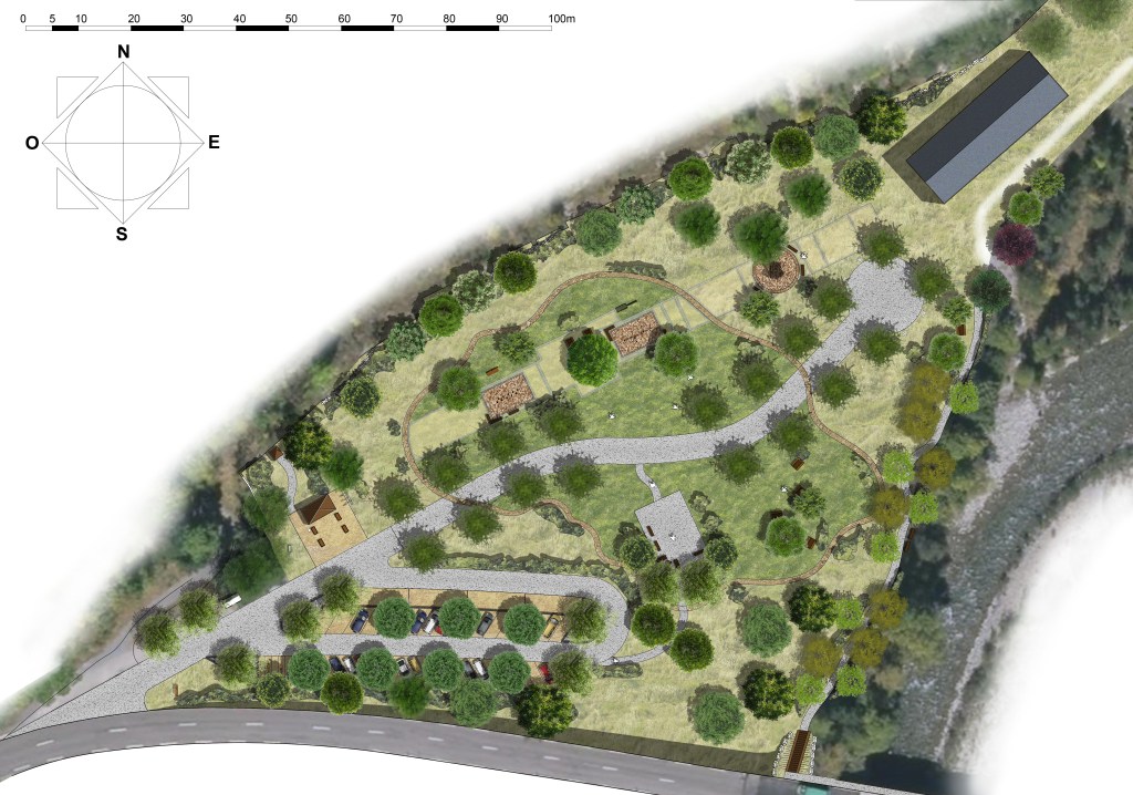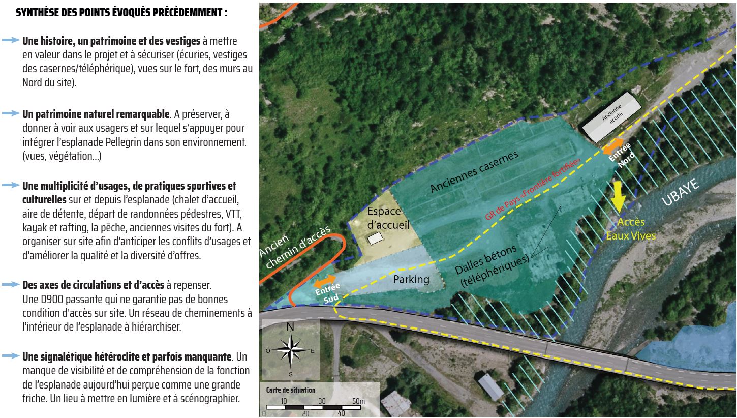 Le projet consistait à réorganiser les 1,5 Ha où résidaient autrefois les casernes Pellegrin, anciens baraquements militaires du fort de Tournoux et des différentes fortifications de la Vallée. L’espace, vaste zone défraîchie où de vastes dalles bétons témoignaient d’une ancienne occupation humaine, nécessitait une révision complète de son schéma de fonctionnement et de déplacement. Le travail à ainsi consisté à lister l’ensemble des usages existantes, des besoins du site, et des potentiels usages pouvant en émaner. De nouvelles circulations douces et automobiles sont proposées, la disposition du parking faisant débat afin de minimiser l’impact de la voiture au maximum sur cet esplanade en cœur de vallée de haute Ubaye. Enfin, les différents espaces d’aménités et de loisirs : espaces de détentes, de repos, de restauration et de contemplation, parcours d’initiation de VTT avec modules bois et modelés de terrains, bloc d’escalade extérieur, modules sportifs (agrès, échelles,…), amélioration et modification du GR « Pays de Frontière fortifié », réagencement de l’accès eaux-vive sur la rivière . L’idée était avant tout de proposer un projet respectueux de l’environnement dans un haut site patrimonial perché à 1300m d’altitude, mettant en exergue à la fois le patrimoine naturel et le patrimoine militaire de ce lieu. L’Ubaye, rivière emblématique, et sa Haute Vallée éponyme demeurant les points d’orgue aux différents aménagements et partis-pris.