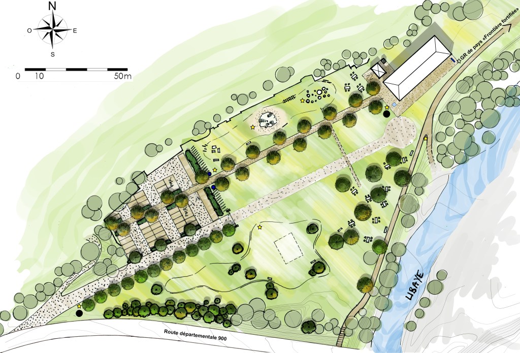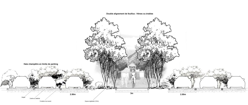 le chalet d’accueil, la signalétique générale du site, le stationnement vélo, les toilettes sèches. - Création d’une ALLÉE DE DESSERTE PARTAGÉE piétonne et véhicule pour l’accès eau vive et écurie (futur CIAP : Centre d’Interprétation de l’Architecture et du Patrimoine à vocation militaire Vauban/Maginot).