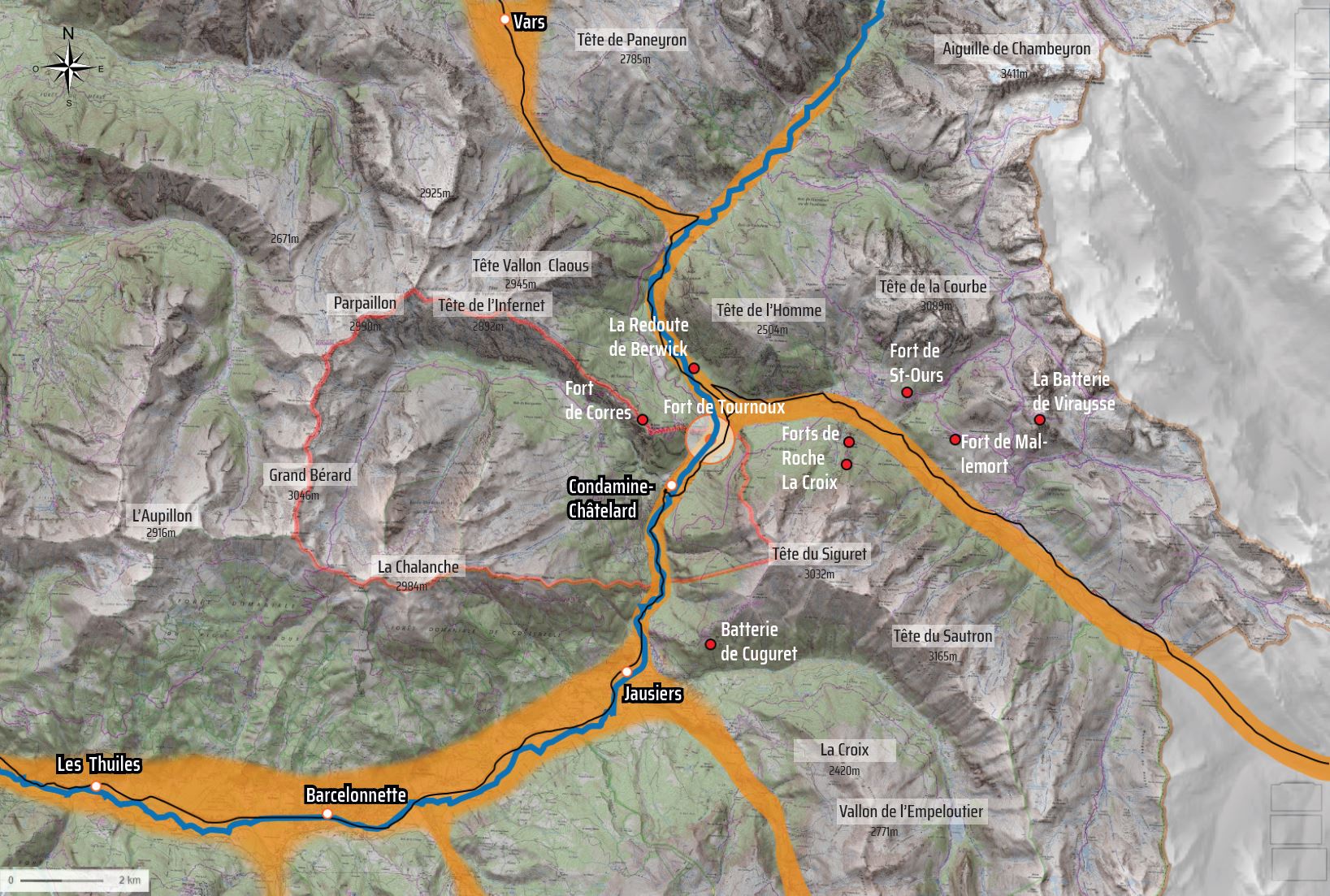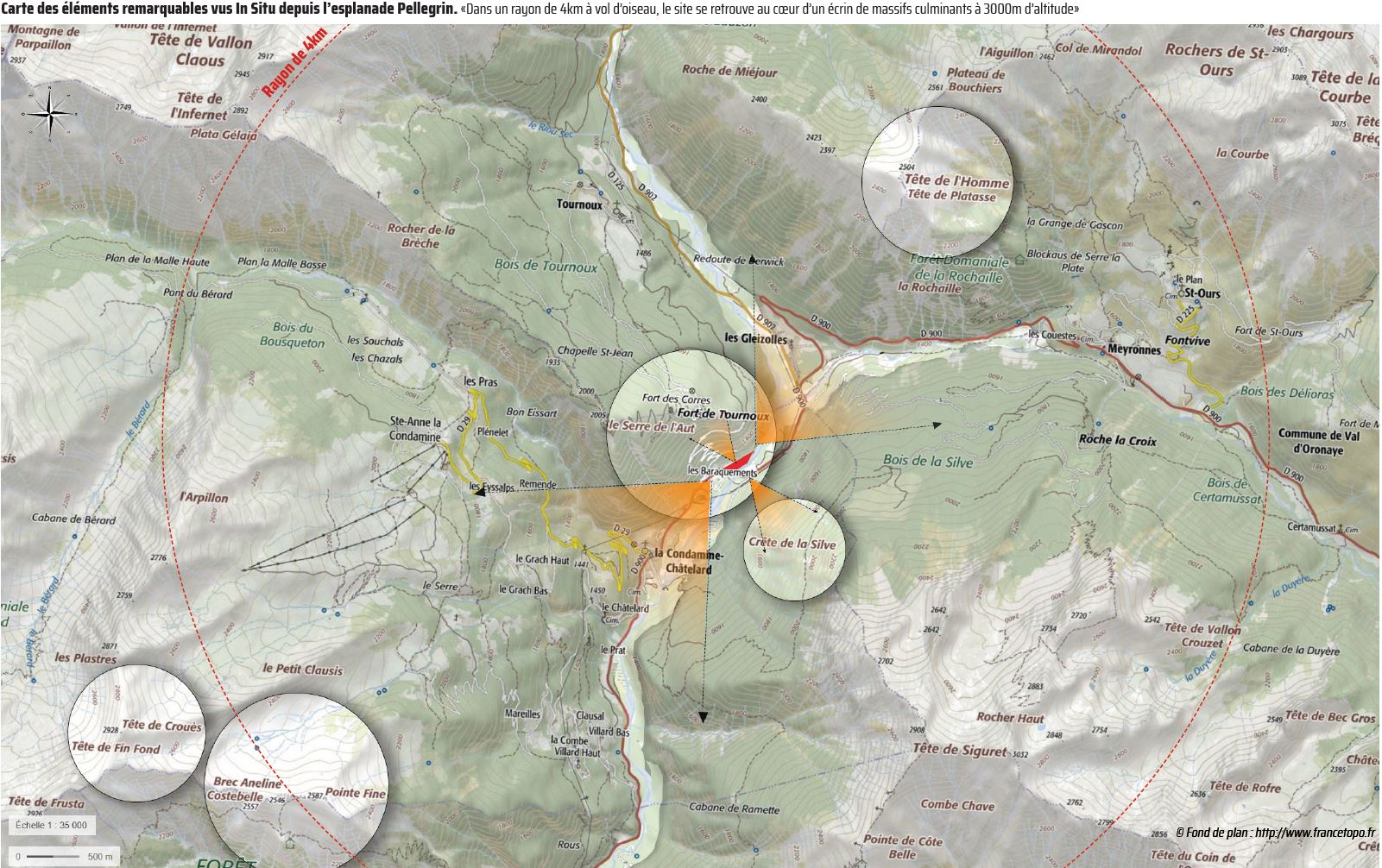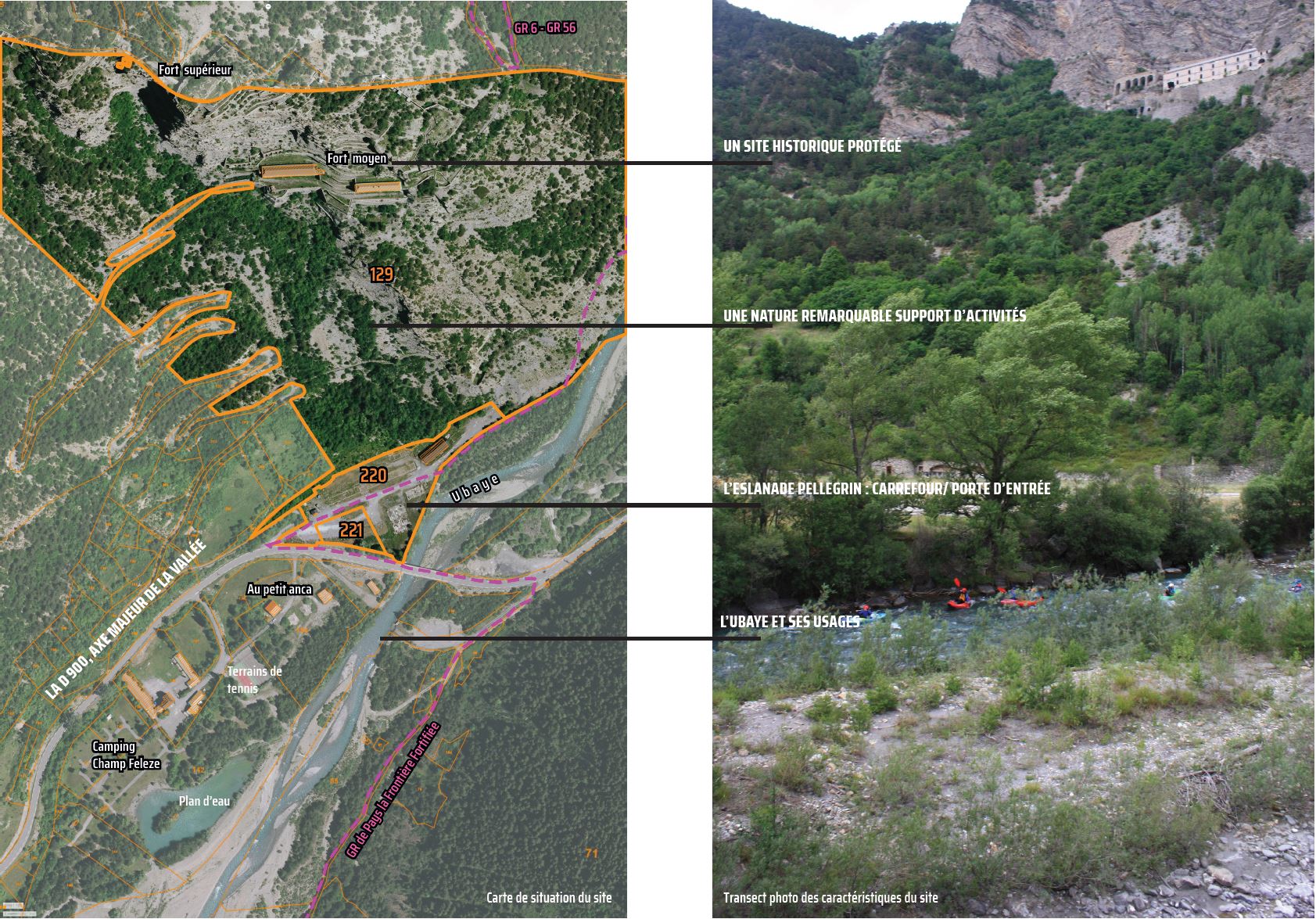 Située dans le département des Alpes-de-Haute-Provence, la commune de La Condamine-Châtelard est à la lisière entre la moyenne et la haute-vallée de l’Ubaye. A 1290m d’altitude, ce site, autrefois sous gouvernance militaire, aujourd’hui aux mains de la commune, revêt une importance patrimoniale, architecturale et paysagère très forte à l’échelle de la vallée. Le site de projet est en effet au pied du fort de Tournoux, structure militaire datant du XIX° siècle et reconvertie par la suite dans la ligne Maginot. Aujourd’hui, la vaste esplanade qui accueillait les casernes militaires (les casernes ou baraquements « Pellegrin »), n’offre pas de réelle attractivité en dépit de sa situation. Surplombé par le fort, en lieu et place des fondations des anciennes installations militaires, réside un vaste espace de 1,5 Ha que les services départementaux et communaux souhaiteraient investir en vue de la future réouverture au public du fort et de son téléphérique.