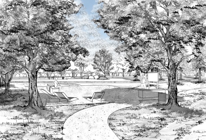 Ce scénario privilégie un parking au nord-est de la parcelle à l’emplacement de l’actuel chalet d’accueil. Un large mail piéton prend le relais de l’accès principal depuis le parking pour inciter les usagers et visiteurs à laisser leurs véhicules dès l’entrée du site. L’importance donnée à l’axe piéton en comparaison de l’accès à l’aire de retournement pour les kayaks ou les pompiers permet de faire oublier la présence possible des véhicules au coeur de l’esplanade et donne une vraie légitimité aux modes doux. Le mail central, planté d’un double alignement alterné (mélèzes, chênes, frênes, érables ou tilleuls) est centré sur l’une des anciennes lignes