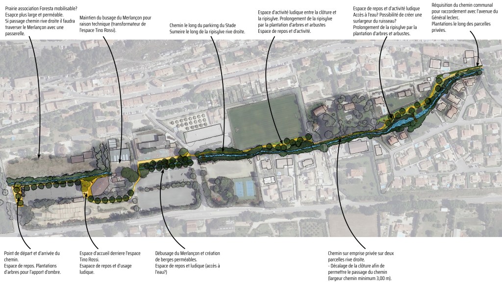 Ainsi, l’objectif est de tourner la ville vers le Merlançon afin d’apporter un meilleur cadre de vie aux habitants avec la création d’une promenade ombragée sous ou à proximité de la ripisylve, ponctuée de divers équipements sportifs, de détentes et de contemplations ainsi que de petites passerelles piétonnes et modes doux permettant le franchissement aux endroits stratégiques du cours d’eau.