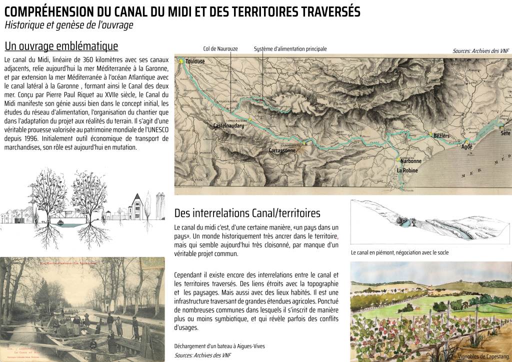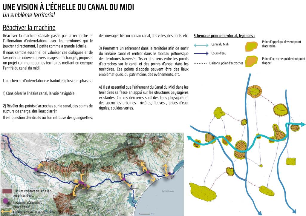 Notre travail a consisté développer plusieurs problématiques et à réfléchir à des solutions efficientes. Le Canal du Midi est aujourd’hui considéré comme un ouvrage technique et non pas comme un vecteur d’aménités pour les communes. Comment s’emparer de cette dimension technique du canal du Midi et en faire un atout pour les territoires traversés ? Comment valoriser ce patrimoine national, comment lui conférer de nouveaux usages afin que son existence perdure dans le temps long et que les générations futures s’en emparent ?