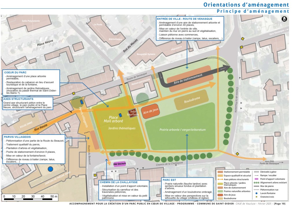 La commune de SAINT-DIDIER souhaite, aux abords de son centre ancien et de son château emblématique, aménager un vaste parc public, créer des aires de stationnement paysagées en adéquation avec les besoins de la commune et requalifier la route du Beaucet en créant une nouvelle centralité piétonne. Ce projet portera sur un ensemble de parcelles d’environ 13 000 m² dont la commune est propriétaire.