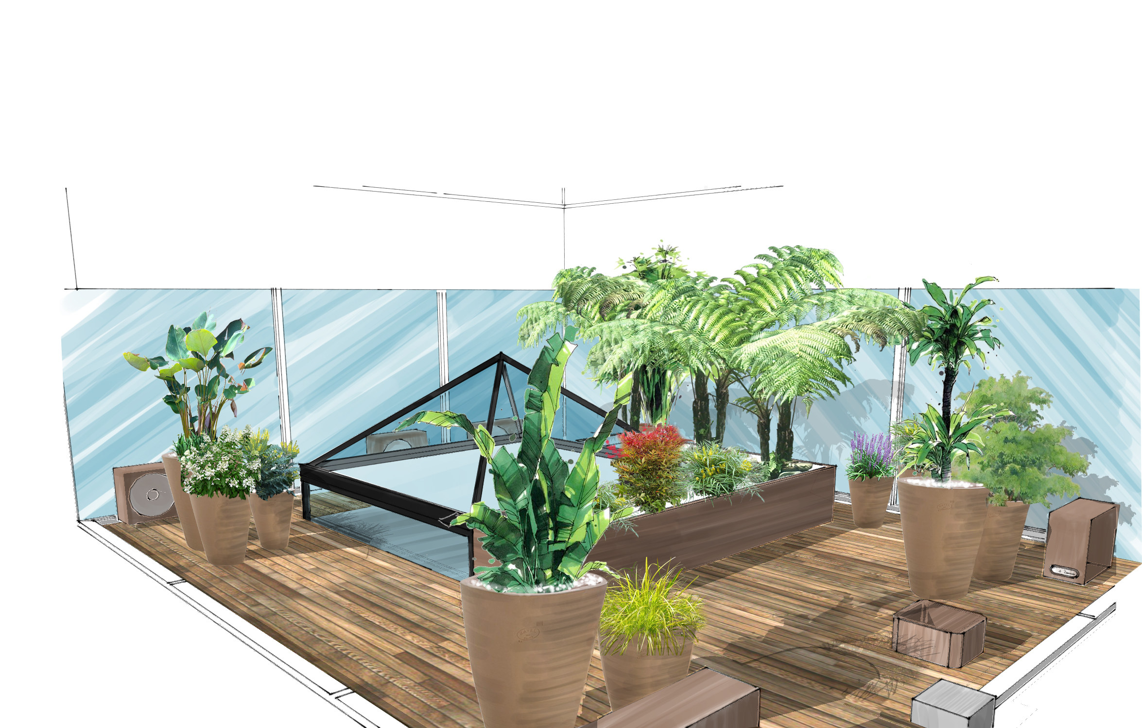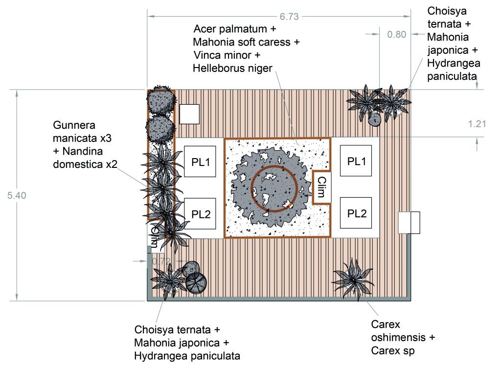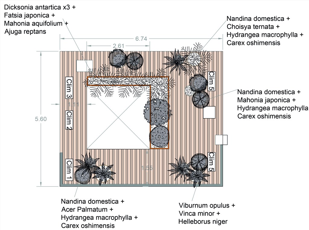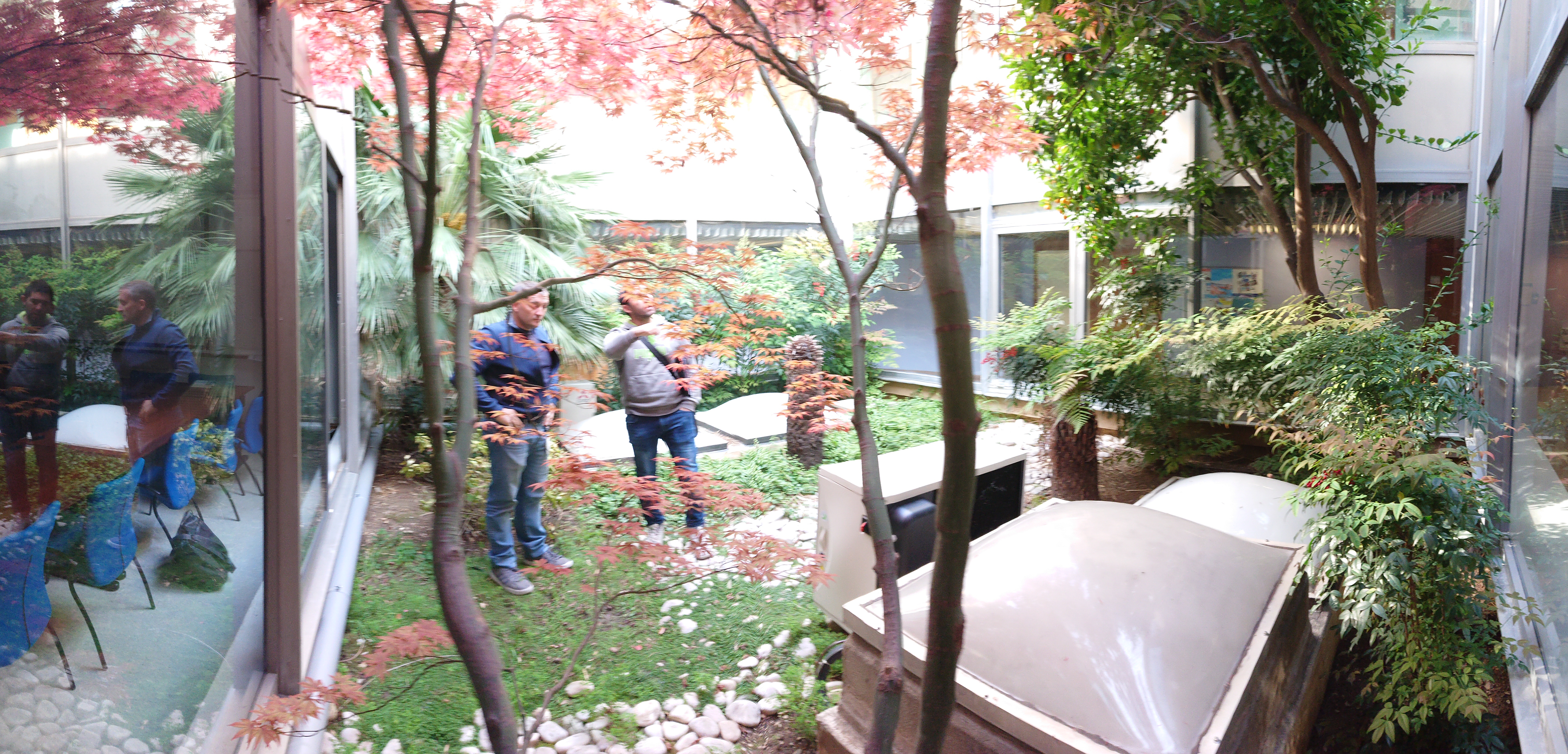 L’artificialisation inhérente au site des espaces de plantations, la présence de murs vitrés entourant ces patios, l’ombre projetée des bâtiments ainsi que l’absence de gelée marquée étant donné la proximité avec la mer nous ont permis d’installer une végétation luxuriante, où l’intérêt pour le feuillage (formes, couleurs, dimensions) détrône presque l’intérêt porté aux floraisons. Gunneras, Mahonias, Bambous, Fougères arborescentes, Érable du Japon, etc… autant d’espèces apportant une bouffée d’oxygène aux différents bureaux et salles de réception donnant sur l’intérieur des bâtiments et par la même sur les deux patios.