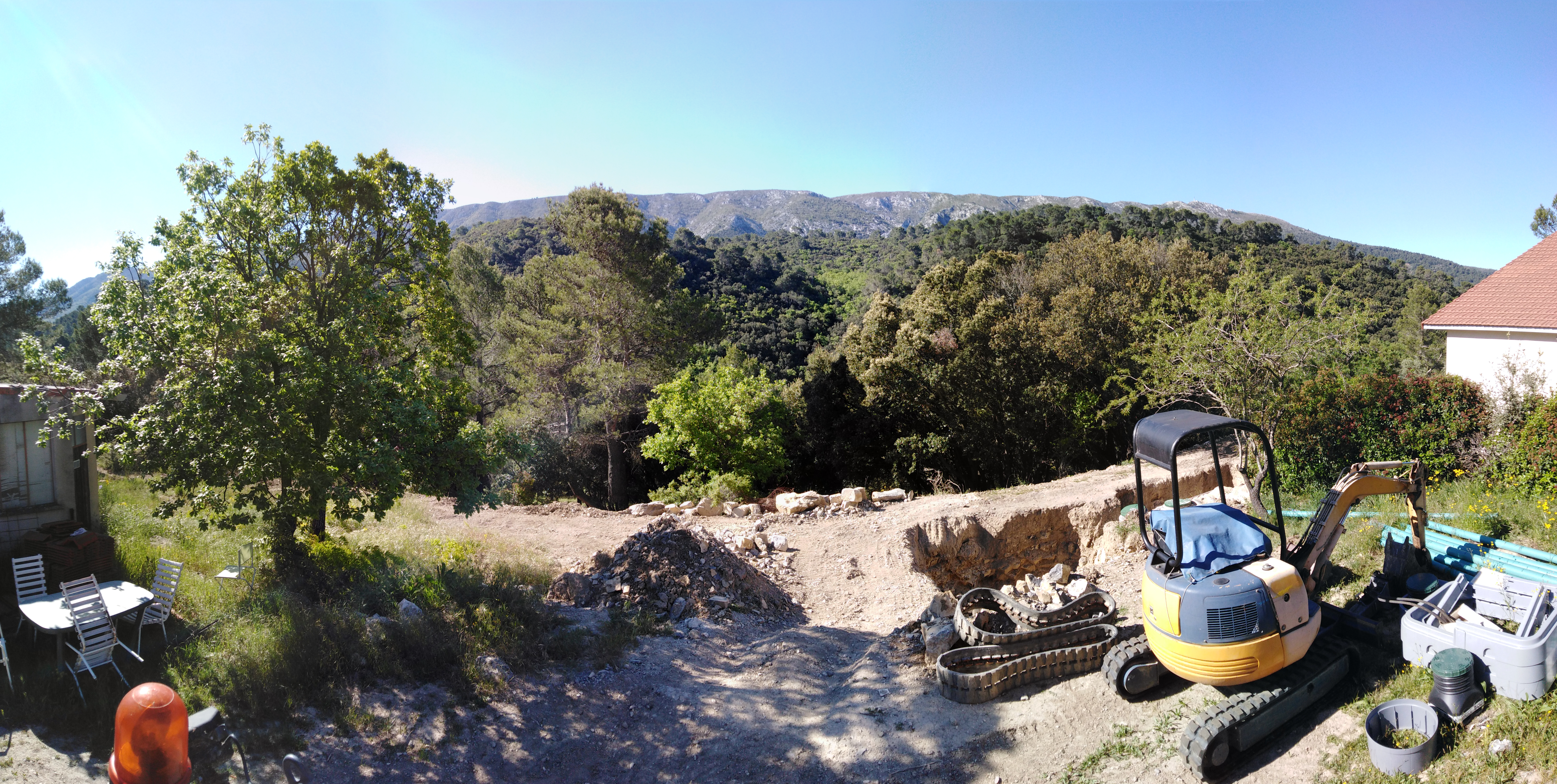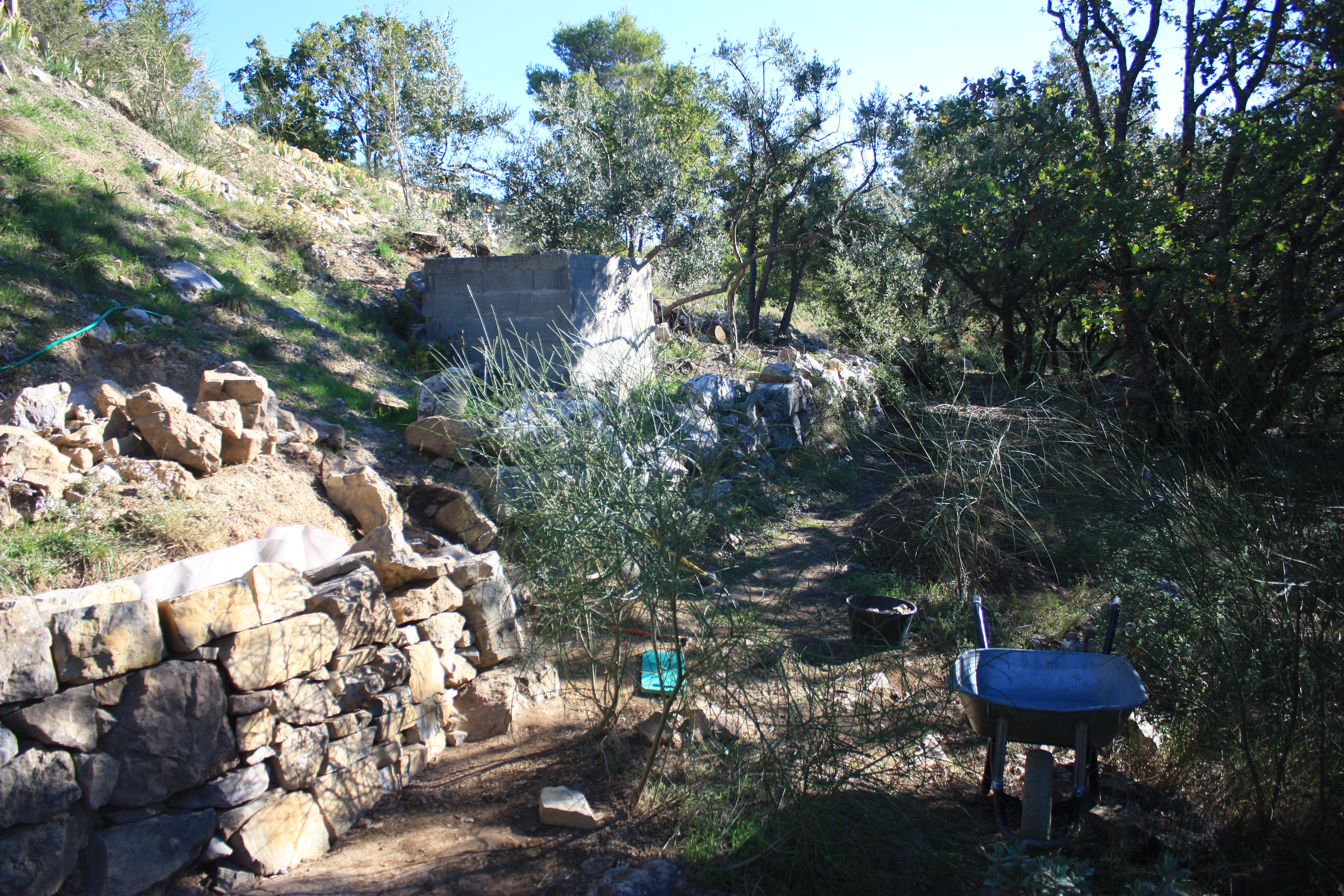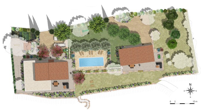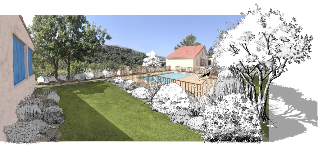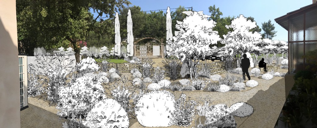 Le projet prévoit ainsi la création de nombreux murs en pierres sèches utilisant celles directement issues du terrain (type pierres de la Cadière). Des escaliers et des banquettes encastrées dans les murs permettent de relier logiquement les différents niveaux du jardin entre eux et d’apprécier les vues spectaculaires sur la montagne Sainte-Victoire. Des arbres adaptés à la sécheresse et des massifs méditerranéens mêlant Helichrysums, Thyms, Santolines, Sauges et autres essences typiquement provençales, encadrent les vues, guident les différents cheminements et délimitent les zones du jardin. Les arbres existants ont été considérés comme des invariants structuraux au jardin et ont donc été conservés. L’usage de toile en fibres naturelles et de paillages (minéral ou organique) et la plantation des différents massifs de végétaux à l’automne permettront de s’abstenir au maximum d’arrosage automatique et in fine de diminuer les frais d’arrosages. Enfin, une prairie rustique gazonnante, une gradation des apports d’arrosage en fonction de la proximité à la villa et une gestion différenciée des espaces « engazonnés » permettront de limiter les apports d’eau en période estivale, l’entretien à l’année (tonte) et de créer un jardin s’inscrivant dans l’ambiance de chênaie que revêt l’arrière-plan du jardin.
